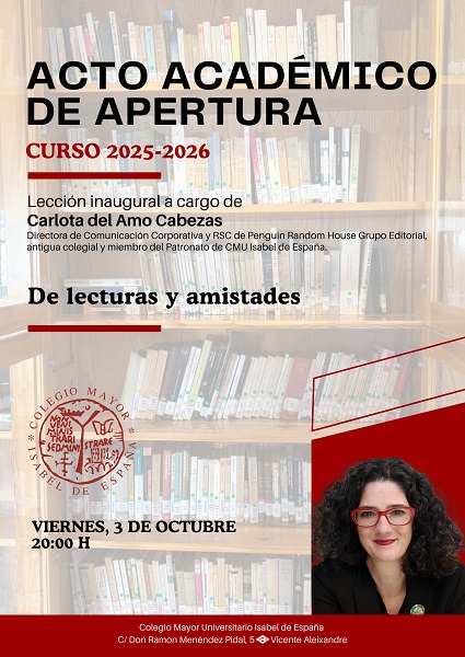 Este viernes, a las 20:00 h, tendrá lugar el Acto Académico de Apertura del Curso 2025-2026, con la lección inaugural “De lecturas y amistades”, a cargo de Dª Carlota del Amo Cabezas, Directora de Comunicación Corporativa y RSC de Penguin Random House Grupo Editorial, antigua colegial y miembro del Patronato de CMU Isabel de España.